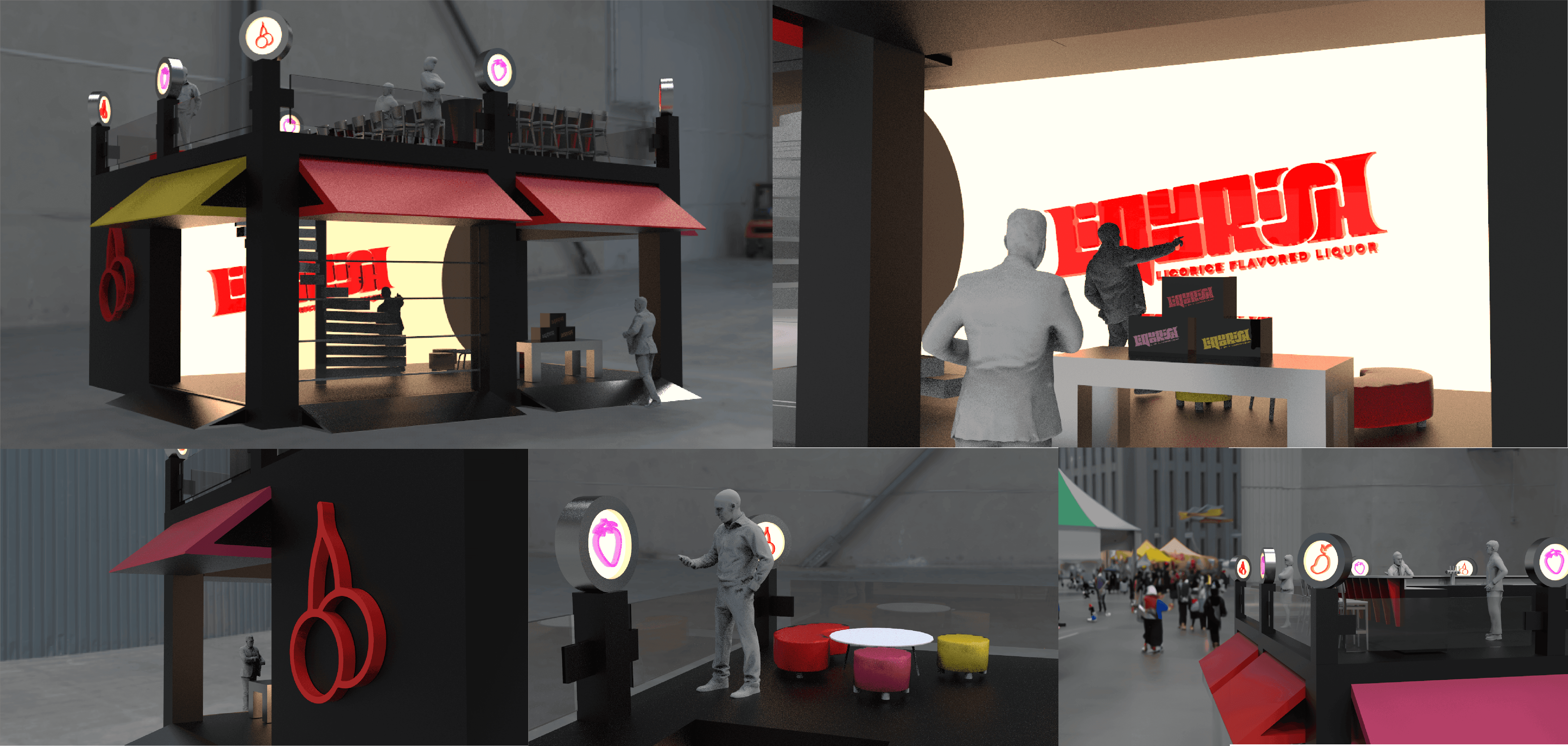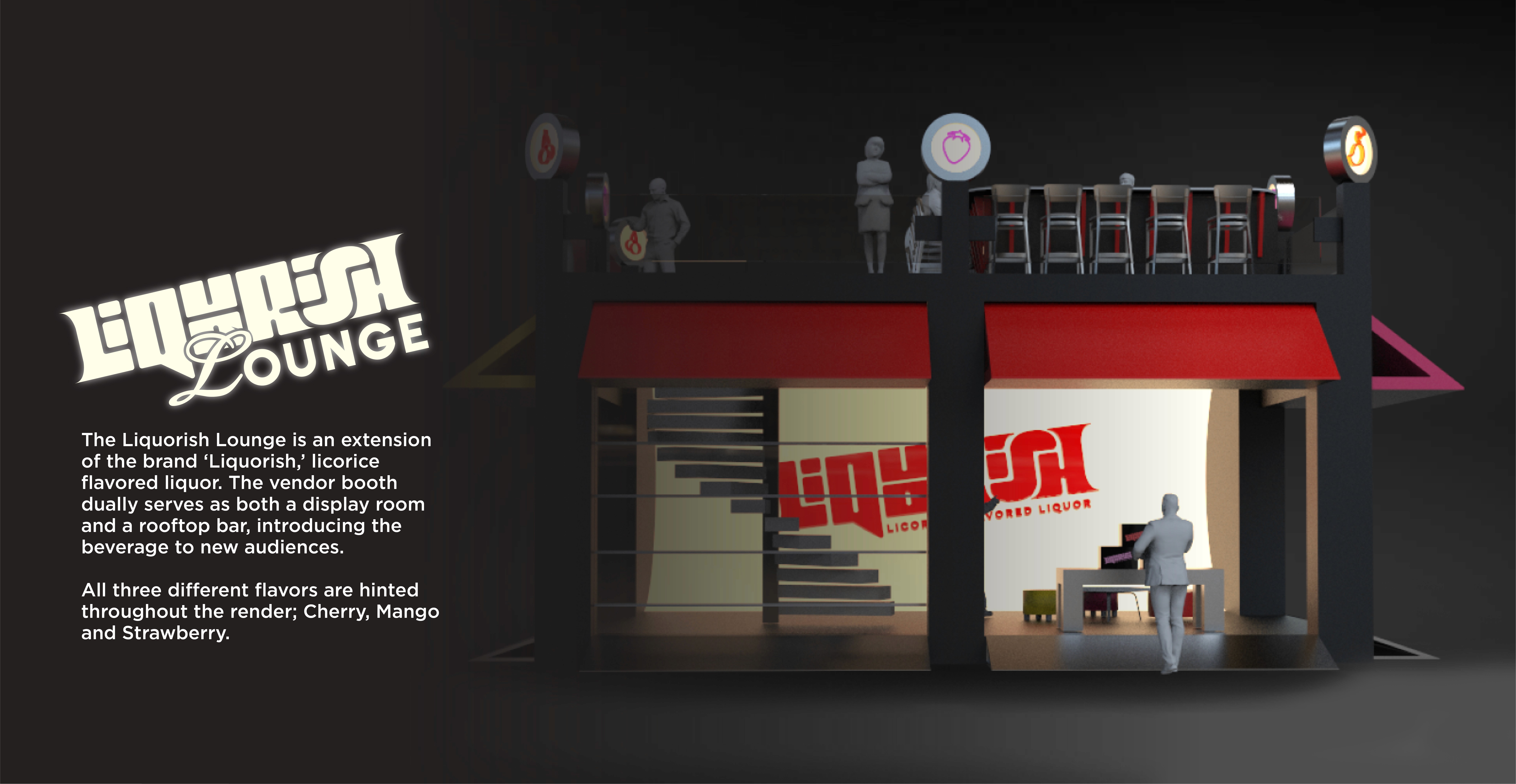 In addition, a three-dimensionally rendered trade booth vendor concept would accompany the unveiling and implementation of the brand in stores. The 'Liquorish Lounge' conveys the fun yet contemporary feel of this drink through its sleek and minimal design.