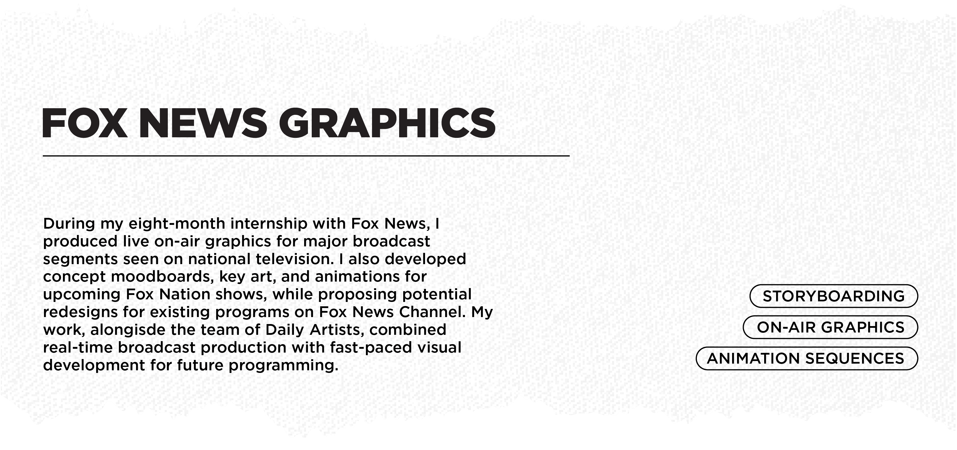 For my Capstone assignments at Fox News, I created concept key art, animation explorations, and storyboards for an upcoming Fox Nation Lockerbie Bombing documentary, as well as a rebrand imagination for the current FNC show 'The Story With Martha MacCallum'.
