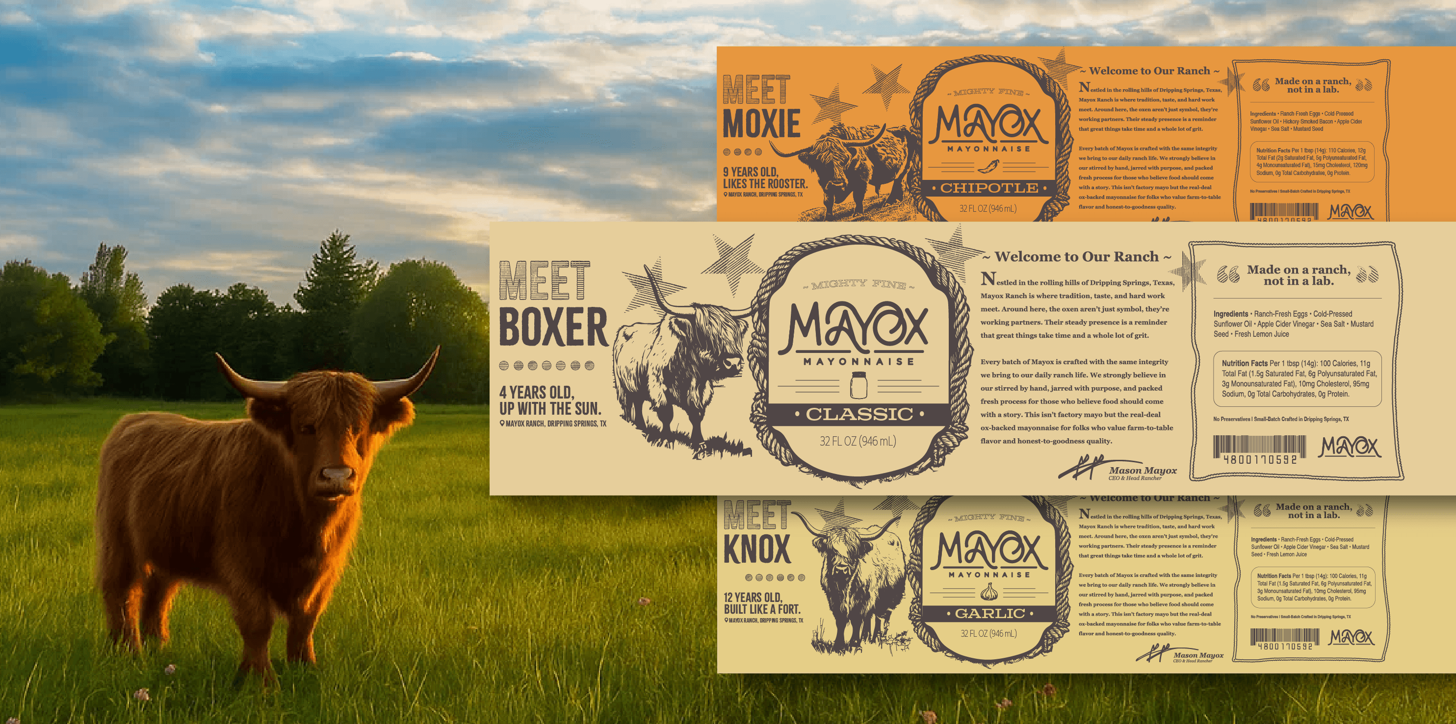 Mayox jars feature distinct, tradition-inspired packaging designed to stand out on any store shelf. From the hand-lassoed lids and cloth-backed covers to the signature ox "stamp of approval," every detail reinforces the brand’s handcrafted, human-quality aesthetic. Each flavor also introduces consumers to a hardworking ox character with a pun-filled name, further bridging the gap between maker and buyer through humor and personality.